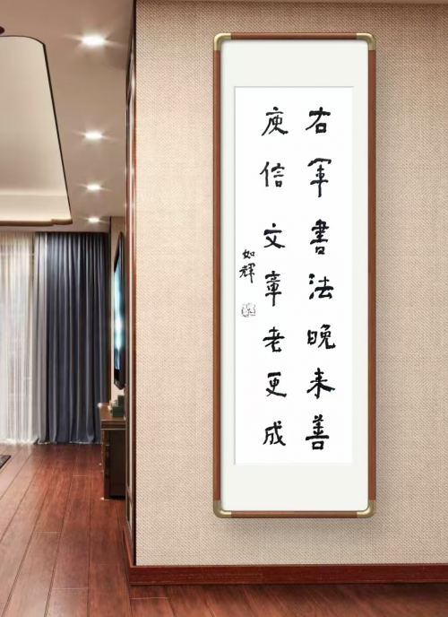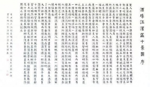 这两副作品,一幅完成于2021年9月2日,即如辉兄用颜楷、八尺宣纸书写的拙文《酒埠江灌区十景》序。书写此卷时,如辉如临大敌,握管时不敢放松一步,九个半钟头如兵戈相接,“一放则气象逋矣!”故作品肉里裹筋,筋里藏肉,骨丰肉润,沉郁顿挫,俯仰有情,已臻化境,而其左笔风格尤具嬗变标志意义。