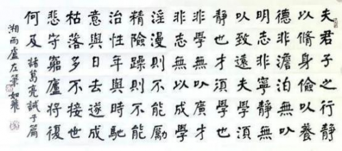 另一副作品,也是如辉在酒埠江灌区即席悬腕书写的爨体《诸葛亮诫子篇》,此作“爨中有颜,颜中有爨”,把颜真卿的宽博宏大与汉隶的朴厚奇态,“若古佛之容”揉合一体,让人不由自主地思接千载,视通万里,回溯起一千五百多年以前,西南边陲少数民族那一段扑朔迷离的历史,情有所动,心亦摇焉。