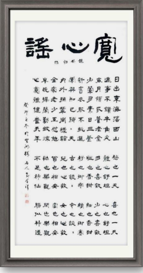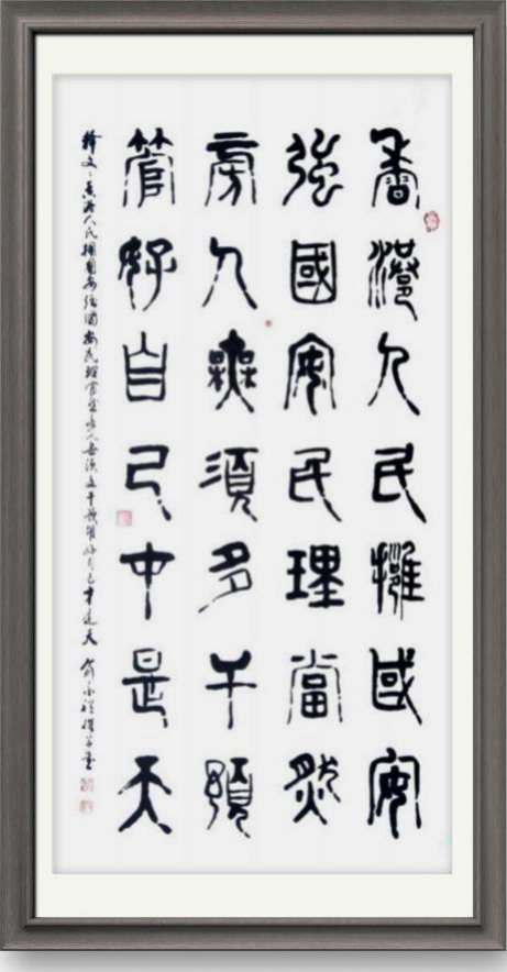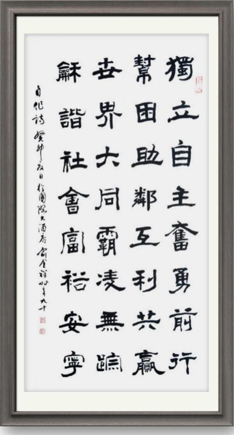 起笔龙跳天门,落墨虎卧凤阙。更为可贵的是,俞金祥先生有着笔墨当随时代的书法思想和扎实实践,书者载道,要有正能量!俞金祥用书法弘扬大国复兴的志向,也有民族崛起的导向。一件楷书大作《润之领袖功劳大》又作隶书上品《习总为首党中央》等,都是书法写下弘
