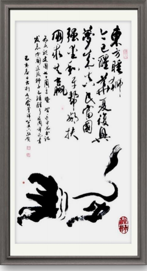 钟大吕的美学张力,一经挂饰,必见中华伟岸的精神力量。一笔象形草书《龙》亦是中华凌云的大气象。唯有技法超群,胸怀国家天下,才可以挥动笔墨写下翰墨奇观,成就书法文化的不世之功!