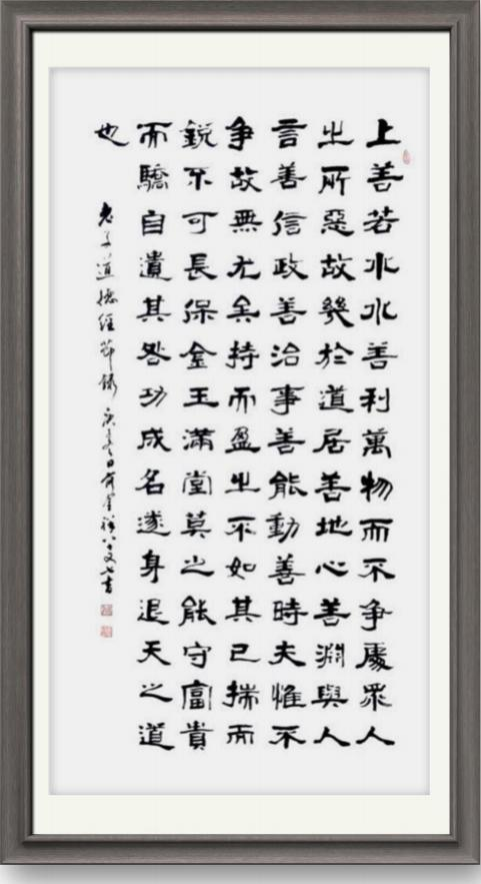 时人之书法,不讲法度的现象比比皆是。殊不知“书法"称谓已经明示,这门艺术首先要执守法度在先的。俞金祥先生历练翰墨法度,可谓精益求精,心追手临历代法帖数十年从不止步,以致于他写下的书法五体兼优,笔有法度,字字求法正,与时下流行的江湖书法相比,他书法的严谨正大,江湖书法则是乱七八糟,两者相较则是云泥之别。所以,从这个意义上来讲,俞金祥先生的书法创作,不仅仅是他个人笔墨修养的成就,也是书法文化传统的公共功勋。只要有像俞金祥先生这样的书法大家引领书法发展的方向,那么书法文化的龙脉当春秋不绝,古今相续。