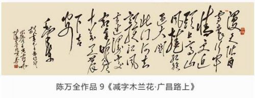 他下笔如行云,似流水,神采飞扬,笔锋游动,擒纵驰张,上下左右,点画间,无一处含糊、懈怠,法度尽在他的指腕之间。陈万全老师的书法,讲求意通神韵,