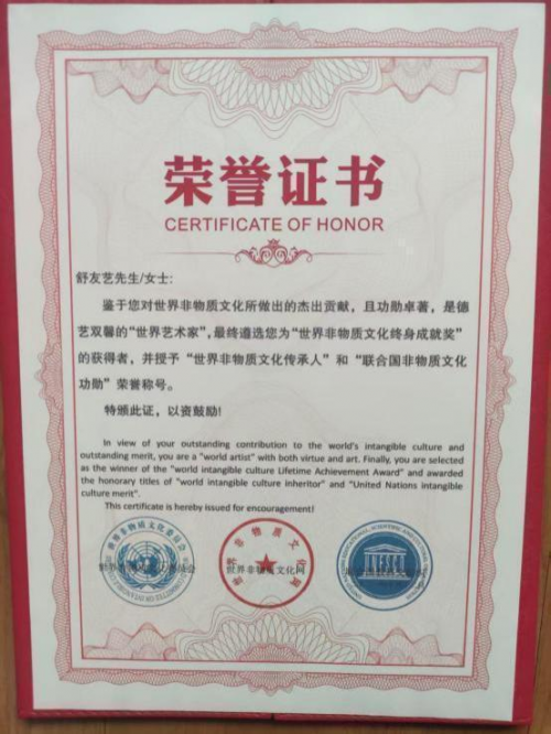 —中国优秀共产党人》、《华夏优秀人物博览》、《中国名人铭鉴》、《世界人物辞海》、《辉煌三十年 ·共和国改革先锋》、《世界华人文化名人》、《世界华人成就博览》、 《党旗下的奉献》、《中国大陆知名专家学者成就展》、《党旗飘飘 ·优秀共产党人》、《祖国万岁》、《新中国名人档案——经典人生篇》、《说话百年——共和国儿女英雄传》、 《光辉岁月—一共和国建设功臣荣誉档案》、《南粤改革先锋》、《文明广东》、《东方之子》、《华人精英人才大典》等书、并入选《中国当代医药界名人录》、《共和国不会忘记》人物专题邮票。近获“首届建国文艺大师杰出贡献奖”、 “感动中国艺术人物奖”,2020 年荣获“国家抗疫文化宣传奖”,并授予“国家文艺界抗疫英雄” ,“国家抗疫宣传大使”荣誉称号等。入选《中国红袍艺术家》,《艺坛名流十三杰》,《世界十大殿堂级艺术大师》等誉称。并获联合国教科文组织“联合国非物质文化功勋奖。