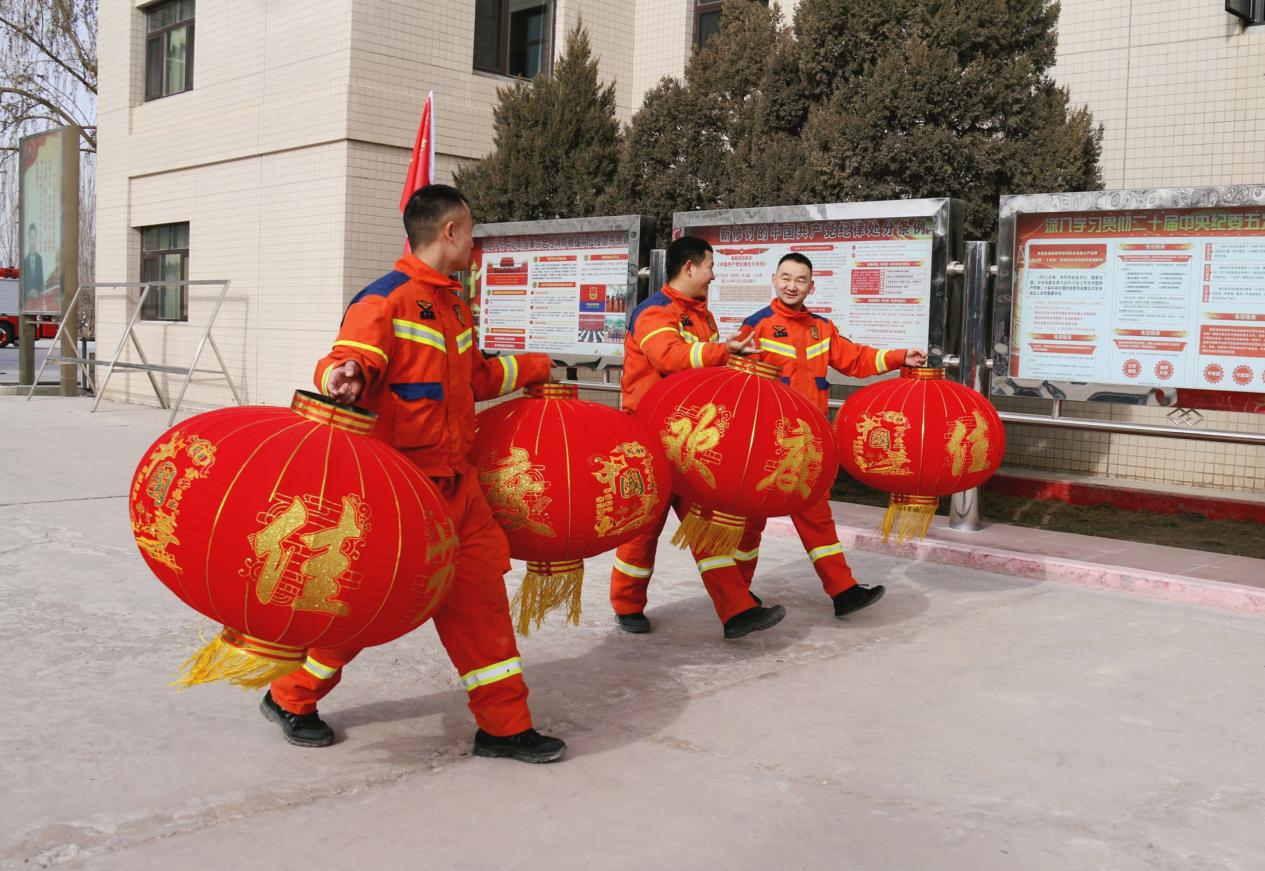 “虽然不能回家过年,但和队友们一起布置营区,感觉特别有意义。看到这红彤彤的灯笼和春联,就像回到了家一样,心里暖乎乎的。”三级消防士王国军的话语道出了全体指战员的心声。