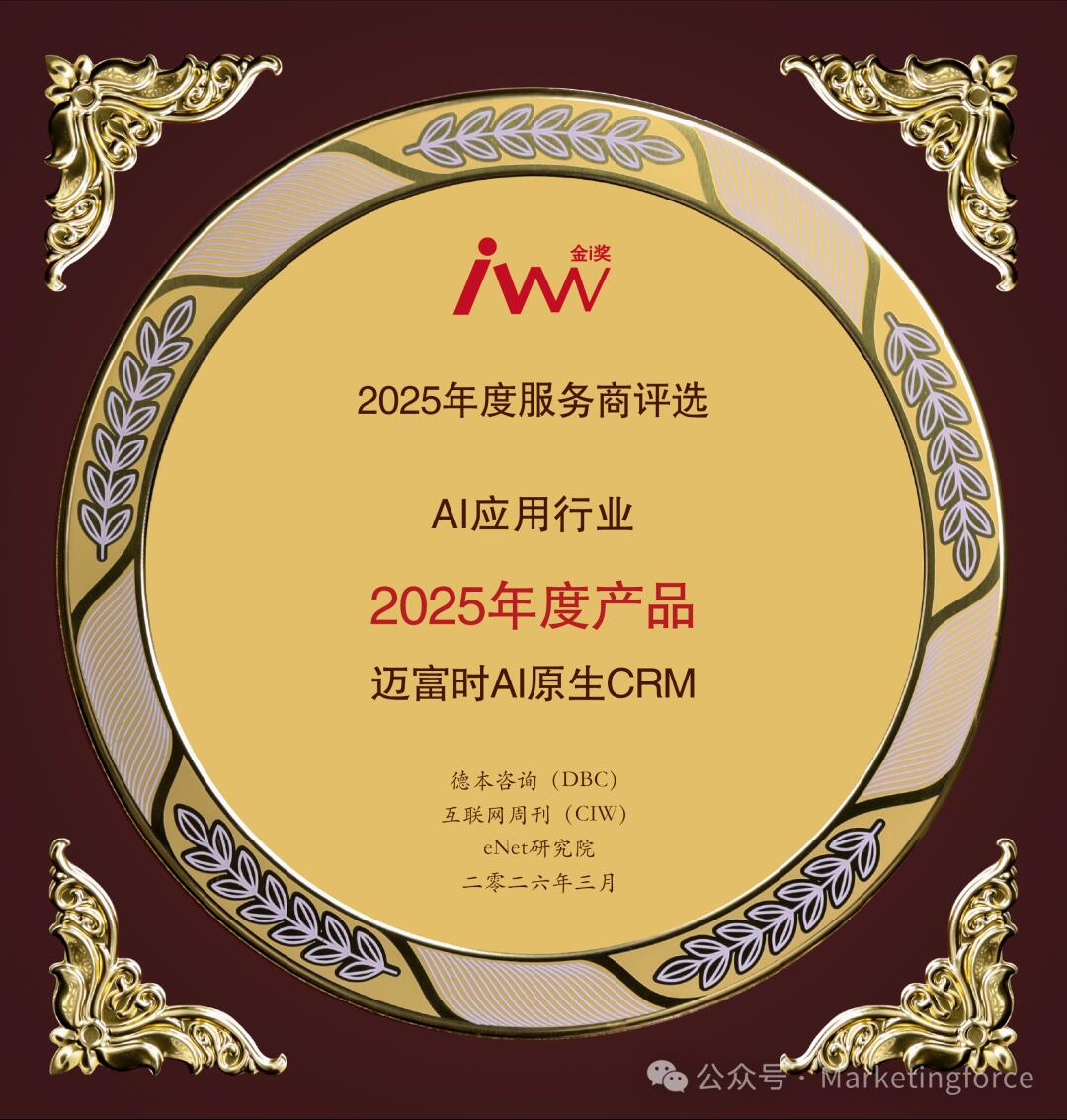 近日,备受行业关注的2025年度“金i奖”评选正式落下帷幕,迈富时AI原生CRM凭借过硬的技术实力、丰富的行业落地经验及显著的应用价值,成功斩获“2025年度产品”称号,成为AI原生客户管理领域的标杆之作,彰显了国产数智化产品的强劲发展势头。
