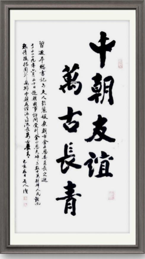 书法一要讲究书法精致,二要体现精气神十足,此两者皆俱,方可以写就金书锦字。有幸看到著名书法大家俞金祥先生的诸件书法作品,一派笔墨铺陈的正大气象扑面而来,形成了笔墨技法相当娴熟,书法精气神卓越足备的气度。在他的书法体系里游目骋怀,感觉地势及而天柱高,南溟深而北辰远,诸如《中朝友谊》《东方睡狮》等等,起笔落墨都是令人赏心悦目的金书锦字。