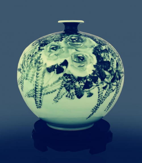 他的梅花,既有传统文人画的笔意与格局,讲究疏密、曲直、虚实的变化,枝干如铁,盘虬卧龙,尽显“梅骨”之刚劲。而在花朵的描绘上,他则展现出更为丰富的艺术语言:或以釉里红等技法,点染出如血如焰的殷红,在青碧的底子上灼灼绽放,展现出生命最原始的热力;或利用窑变产生的微妙色彩,营造出梅花在月色下、在风雪中若隐若现的朦胧诗意。最为精妙的是,他将青瓷开片这一原本被视为“瑕疵”的物理现象,转化为艺术语言。细密的冰裂纹恰到好处地依附于梅枝之上,宛如自然天成的冰霜雪挂,既是材质美的极致体现,更是对梅花“凌寒独自开”傲然风骨最直观、最深刻的视觉诠释。此刻,画与瓷已浑然一体,梅的生命律动被永恒地封印在晶莹的釉质之下,实现了从瞬间到永恒的艺术升华。