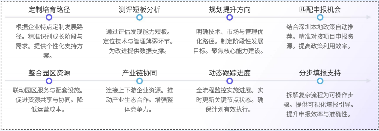 企业:大幅降低信息搜寻成本和政策申报风险,提升政策红利的获得感;通过精准测评和培育建议,助力企业科学规划发展路径,加速成长。