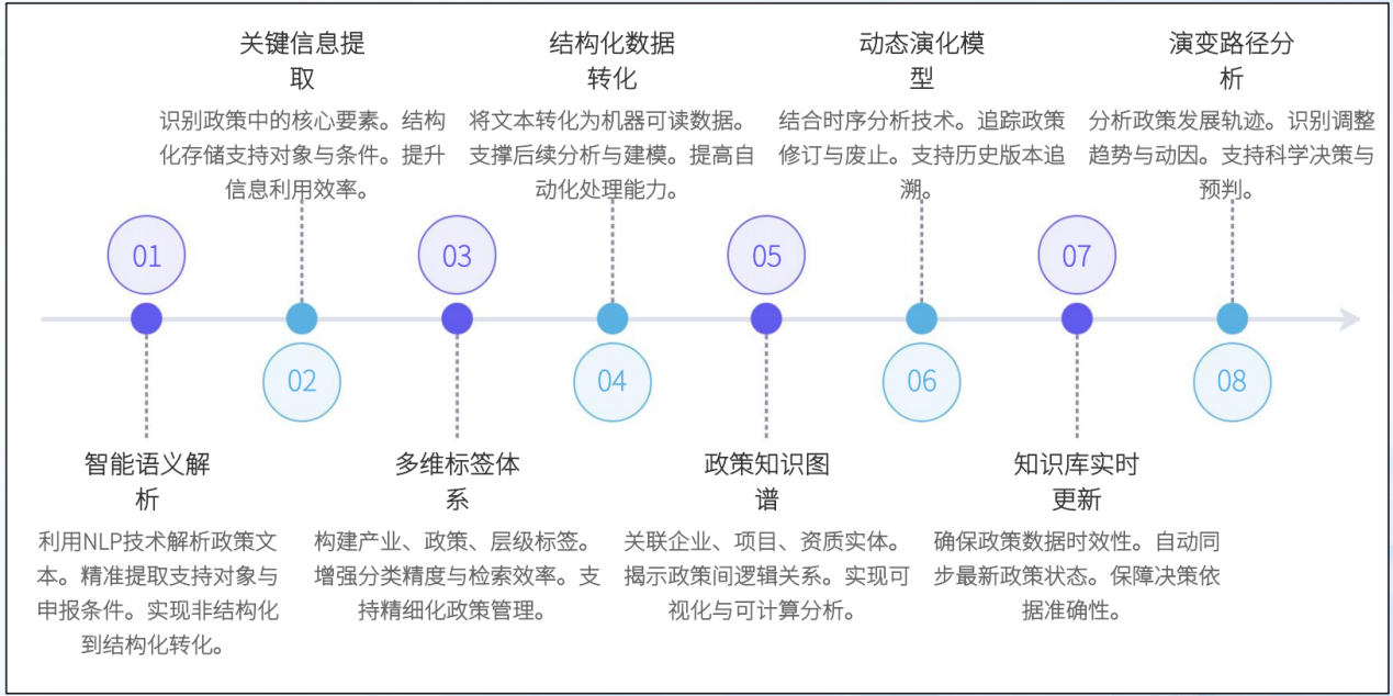 1、政策标注:通过AI自动标注+人工规则校验的混合智能方式实现。首先,系统利用NLP技术对原始政策文本进行语义理解,自动识别并抽取关键要素,如支持对象、申报条件、扶持类型、资金额度、主管部门、有效期限等,并打上多维度结构化标签。随后,结合行业业务规则库和政策知识图谱,对AI标注结果进行逻辑一致性校验与修正,确保标注的准确性与合规性。整个过程实现了从非结构化政策文件到高精度、可计算、可追溯的结构化数据的高效转化,为后续的政策匹配、对比、问答等智能服务奠定了数据基础。