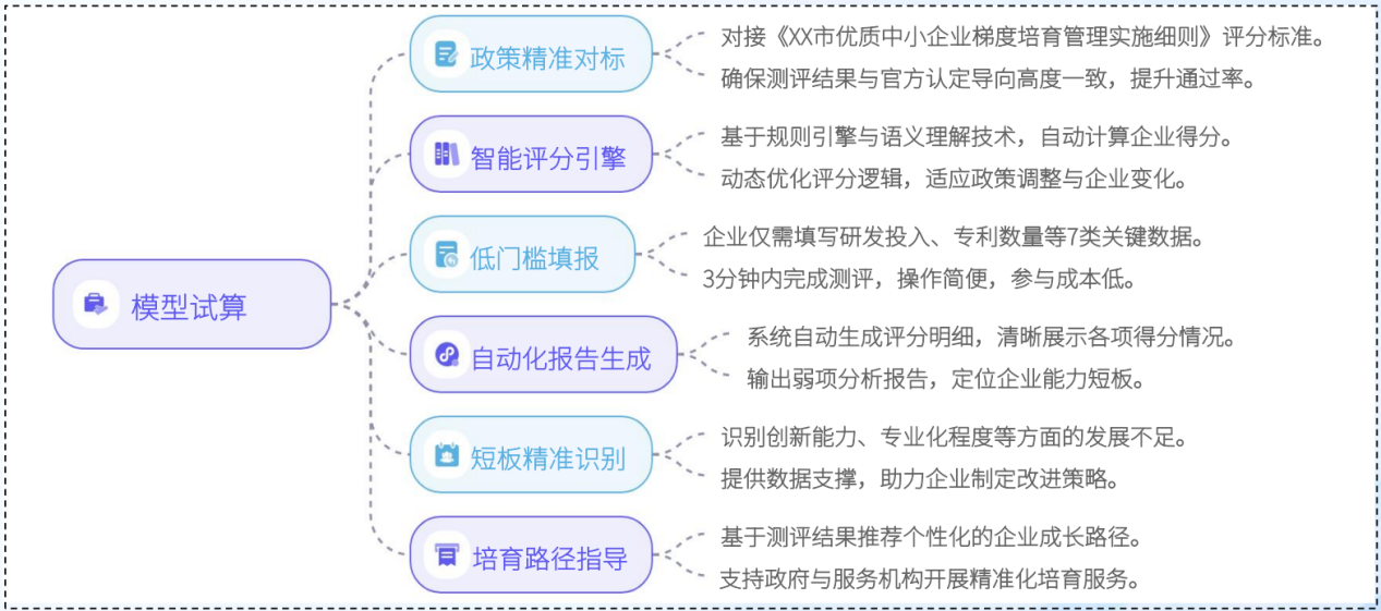 “专精特新”智能加速:基于人工智能技术开发的专项政策智能测评工具,大幅降低信息搜寻成本和政策申报风险,提升政策红利的获得感,通过精准测评和培育建议,助力专精特新企业科学规划发展路径,加速成长。