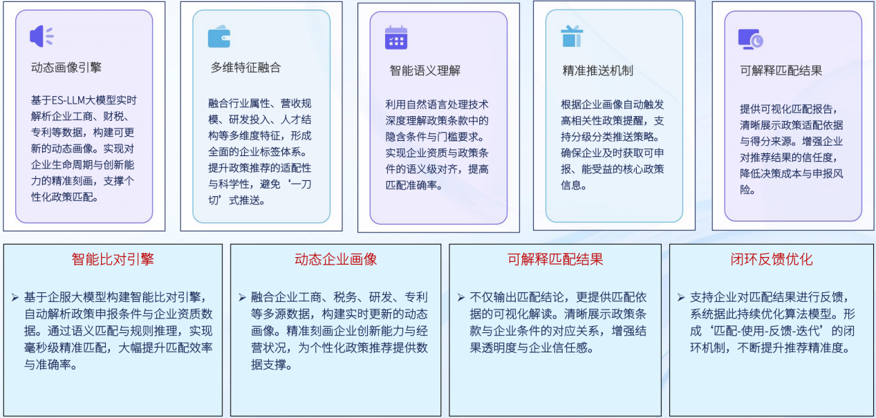 2、基于政策知识图谱和企业服务行业知识图谱进行增强训练的垂直领域模型:具备深度理解政策条款隐含条件、精准刻画企业动态画像、进行语义级智能匹配的能力,实现AI政策匹配,核心算法已通过国家网信办备案,确保了技术合规性与创新性。