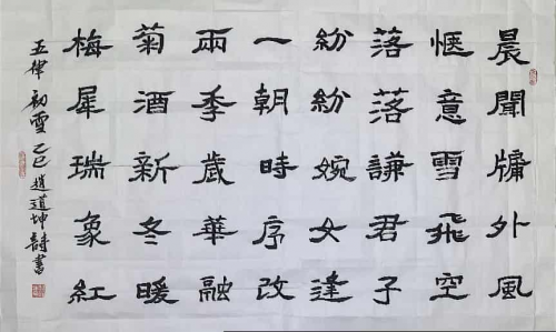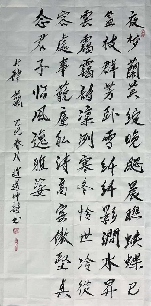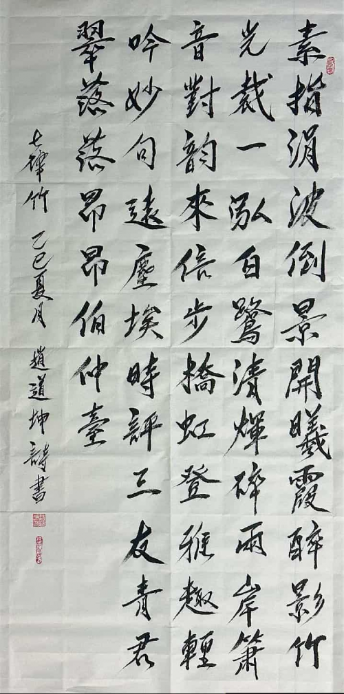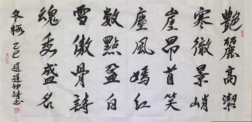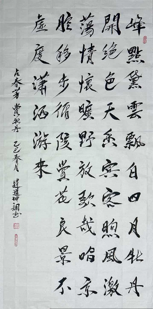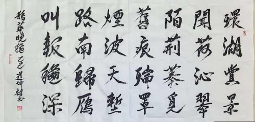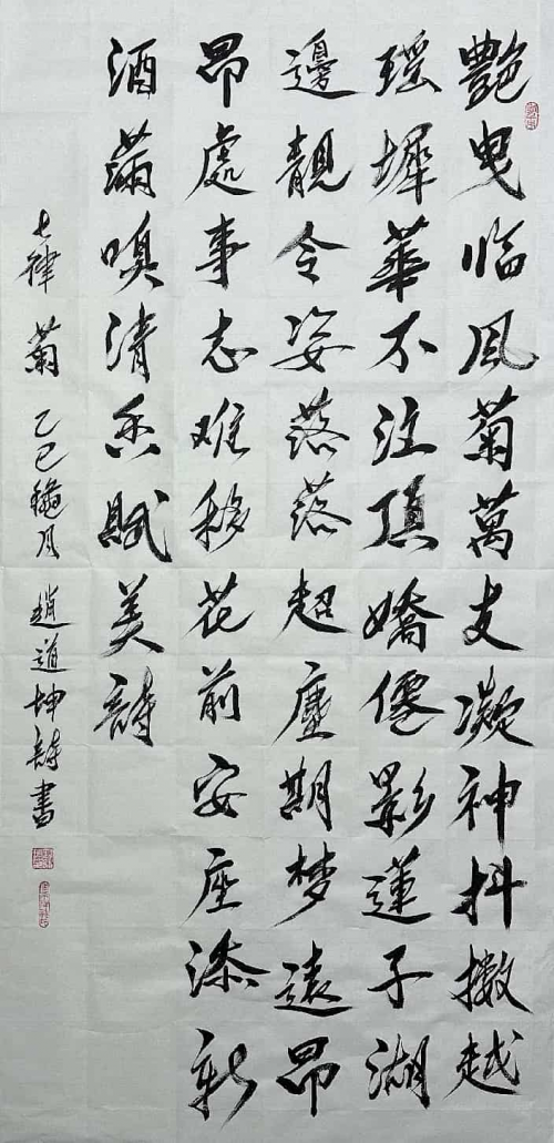 意在笔先,笔在意后,赵道坤先生的书法创作的原则,下笔之前已心中有物,笔随心走,放手写心,从而使得每件书法作品都具有境由心生的感染力,驾驭技巧炉火纯青,承载文化如临峰顶!书法与诗歌修养相得益彰,构建了一个充满文化哲思的书道空间。笔墨从经典中汲取灵感,将诗词气韵融入创作,所写所书尽是文化之气也!
