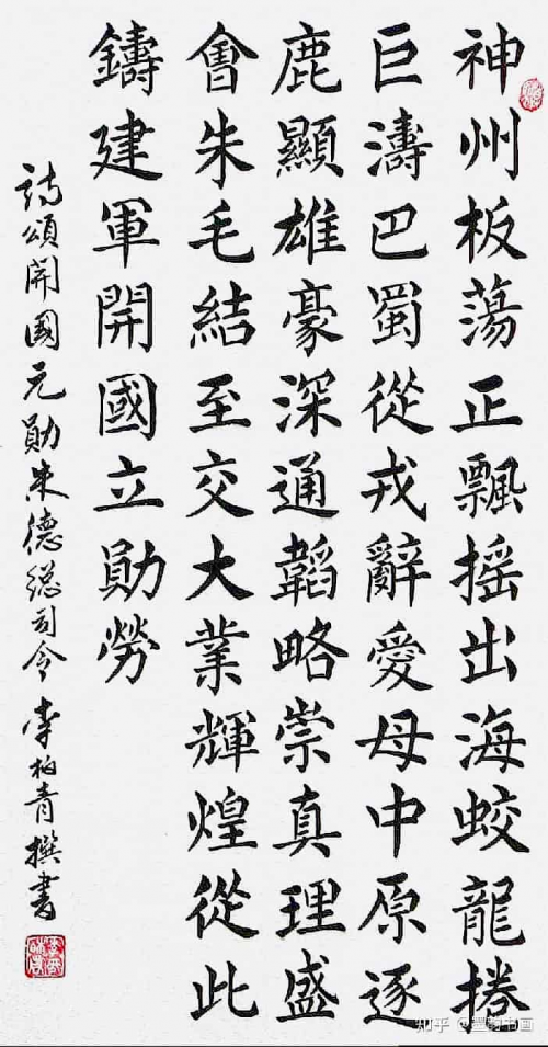 李柏青的楷书,根基极其深厚。他显然深谙楷书发展脉络,对唐楷的典范——如颜真卿的雄浑博大、柳公权的劲健峻拔、欧阳询的严谨险绝——进行了长期而精深的研习。其点画形态精准,结构比例匀停,起笔、行笔、收笔皆一丝不苟,展现出对传统经典法帖的深刻理解和娴熟驾驭。同时,他并未囿于唐楷一脉,更将目光投向魏碑的雄强朴茂与晋人小楷的萧散简远。其笔下线条,既有唐楷的圆润饱满与弹性张力,又巧妙地融入了魏碑的方折峻利与金石气息,使字字如“铁画银钩”,骨力洞达,力透纸背。