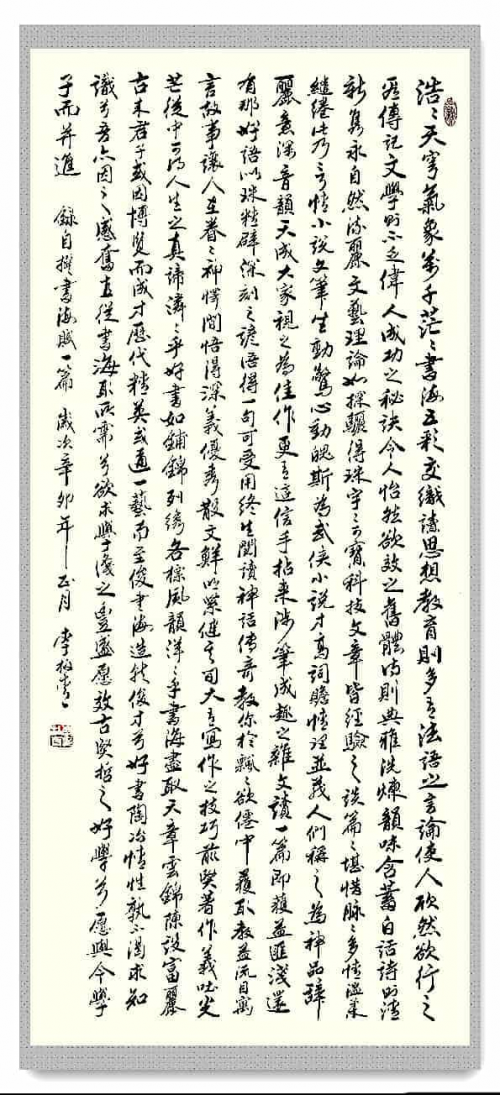 李柏青的墨迹,如一条游龙,在无边的墨海之中,既汲取着千载深流的滋养,又勇于劈开新的航道。当人们为那些仅得古之形骸的作品所疲乏之时,李柏青的作品则提供了一种弥足珍贵的可能——那便是以深广的传统为基石,以个体生命为熔炉,在当代淬炼出具有文化重量与个性光芒的笔墨境界。