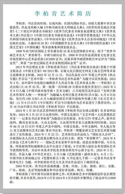 "大书者,非尺牍之微,乃铁笔刻星辰,墨池吞云海之象;弘道者,非空言玄理,实以金石为骨,以血泪为韵之志。九千联者,非数之极,实一字一乾坤,一联一洞天之境。形而上者谓之道,形而下者谓之器。"李柏青先生之书法艺术,既重笔墨之"器",更求文化之"道"。其艺术人生,堪称"研磨之际,日进日新"之典范。当此数字化时代,先生以"寂然凝虑,思接千载"之定力,守护传统文化命脉,又"悄焉动容,视通万里",开拓艺术新境。吾辈当效先生"读万卷书,行万里路"之精神,使中国书法这一"国粹"永葆生机,光耀寰宇。