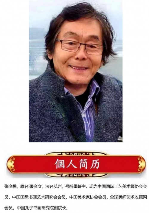 張渔樵,名彦文,字渔樵,号醉墨軒主,书画以字行,1954年生,山东济南人。16岁拜师习画,早期以油画为主,尤喜欧美印象派及抽象表现主义画风,后于1987年再习中国画,经多年探索研究,创造出一种即不失东方韵味又具有现代感的独特风格。现为央视书画频道.CCTV中视文化频道,环球华商书画院,墨缘斋北京国际传媒公司签约画家。中国国际工艺美术师协会会员,中国国际书画艺术研究会会员,中国美术家协会会员,全球民间艺术收藏网会员,中国东方艺术研究会专业人材库入驻书画家,中国孔子书画研究院副院长。被聘为国家美术师及润格评审委员会艺术顾问,香港书画网艺术顾问、美国文欣教育集团艺术顾问、中华万里行书画艺术研究员等。作品先后参加过香港华人国际书画展,韩国中国书画家联展,美国国际艺朮展及欧洲六国绘画巡迴展。绘画作品多次被国家邮局和国际邮政网出版邮册,被中外多家画廊机构和企业收藏家购买收藏。出版个人专集有《中国当代书画名家张渔樵》、《意象油画、张渔樵》、《书画大家、张渔樵》、《当代实力派画家张渔樵》、《渔樵书画》、《写实写意抽象_張渔樵》等多种书画专集。