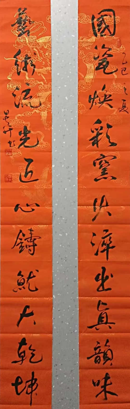 何为好的书法,笔者认为就是因其能写出大多数人心中都有,但笔下却无的东西。对于一个书法家来讲,他的作品突破了自己的程式,在新的起点上,带来了曙光,那就是好作品。虽然都是纸笔,但如何调换力度和角度让纸和笔去磨擦,从而呈现出新意之作是很难的,因为书法经历了几千年成熟传承,想要找出一个与古人有别而又不“偏轨”的自我不太容易。这就要求书者除自我感觉和古人的共同部分,还必须有相异部分,在表达方式上才有所不同。才能仿古不泥、传承而出新,在这方面曾老师有独特的实践与见解。笔者请曾老师谈下对书法创作的感受,他说:“我们写字不是为了抄袭古人,如果去追求一模一样,那么我们用复印机就可以了。我们模仿古人的字是为了学会那个‘审美法则’,学会了以后可以加入自己的情感和理解,或者融合一下古人的字体,把好的东西再优化,这样才算是进步了。但是这个过程不容易,甚至需要我们用毕生的精力去探索……” 一番精辟见解,虽不是什么闳言高论,但足以看出曾老师在想求书法艺术之路上与众不同的境界。