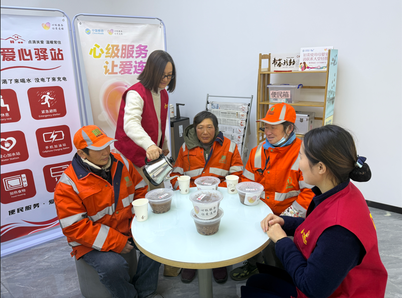 春节前夕,清晨五点半,环卫工人李阿姨在街头忙碌。经过服务厅时,她被值班经理请了进去:“阿姨,进来暖和下,喝碗八宝粥。”这里是厅里专设的“户外劳动者爱心驿站”——热粥、姜茶、充电器、休息椅,都是免费的。李阿姨捧着碗笑:“这碗粥下肚,整个人都热乎了。”等候的时间里,服务人员和她聊起近期常见的诈骗手法,帮她识别手机里的可疑信息。“多亏你们提醒”,李阿姨感慨,“不然真可能上当。”