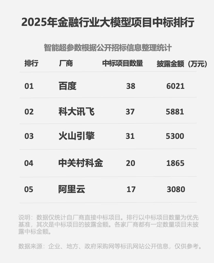 1月31日消息,根据近期媒体对2025年公开市场大模型相关招投标信息的统计,金融行业全年大模型中标项目达587个,中标金额约15.06亿元,较2024年分别增长341%、527%。其中,百度智能云连续两年成为中标项目数和中标金额最多的厂商。