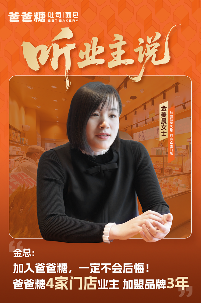 今天,我们有幸采访到爸爸糖吐司面包的山东加盟业主金美晨女士。从一枚令人惊艳的吐司开始,到三年时间成功运营四家门店,金女士的故事,是一位“铁粉”将味蕾的钟情转化为事业版图的生动写照。她的路径,不仅是个体创业的成功,更折射出在行业洗牌期中,头部品牌如何通过产品力、运营体系与品牌温度,构建起让创业者愿与之长期同行的深厚纽带。下面,让我们一起来听听她的成功经验。